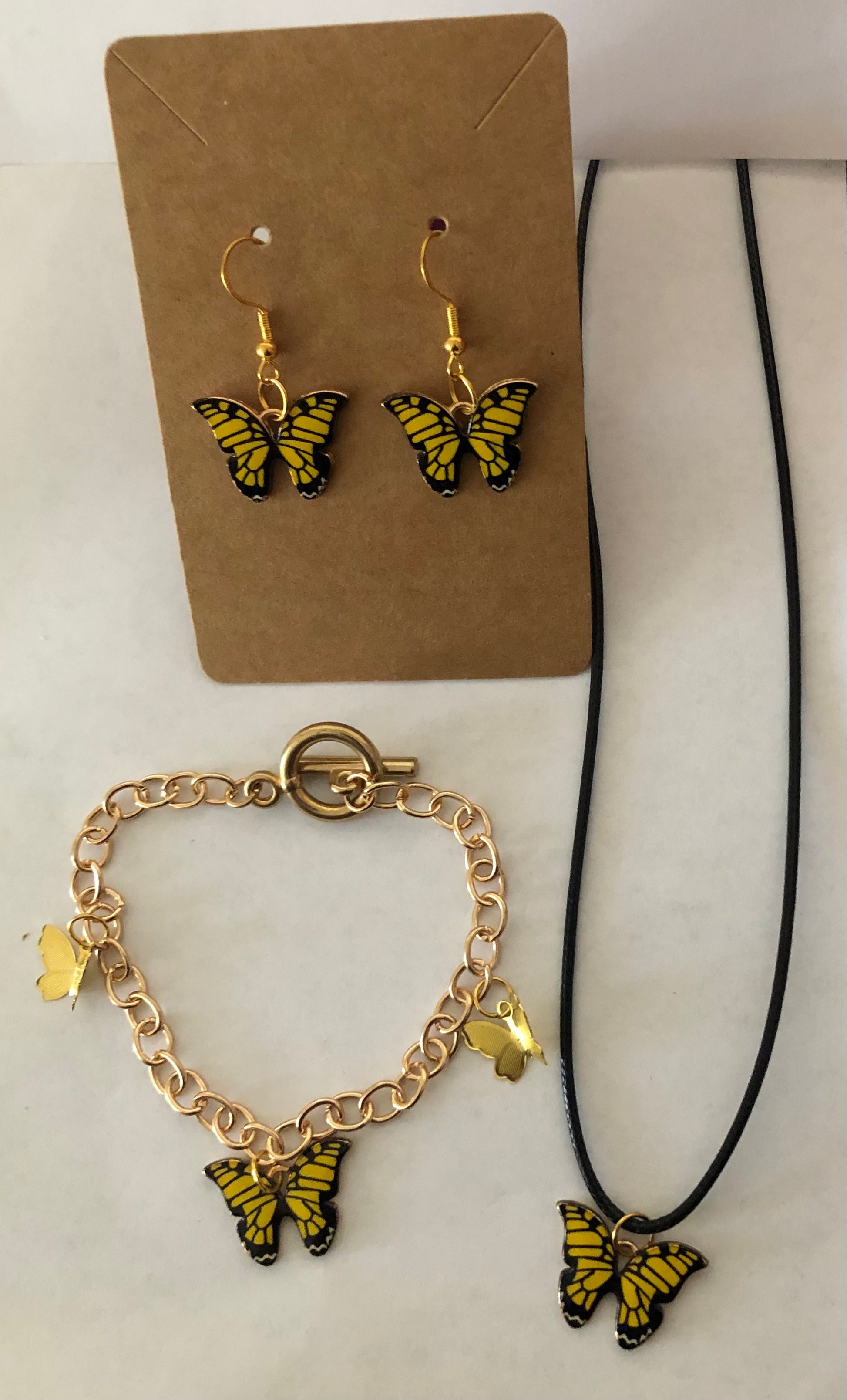 Includes 1 chain bracelet with butterfly charms, 1 pair of butterfly earrings, and 1 necklace with butterfly charm