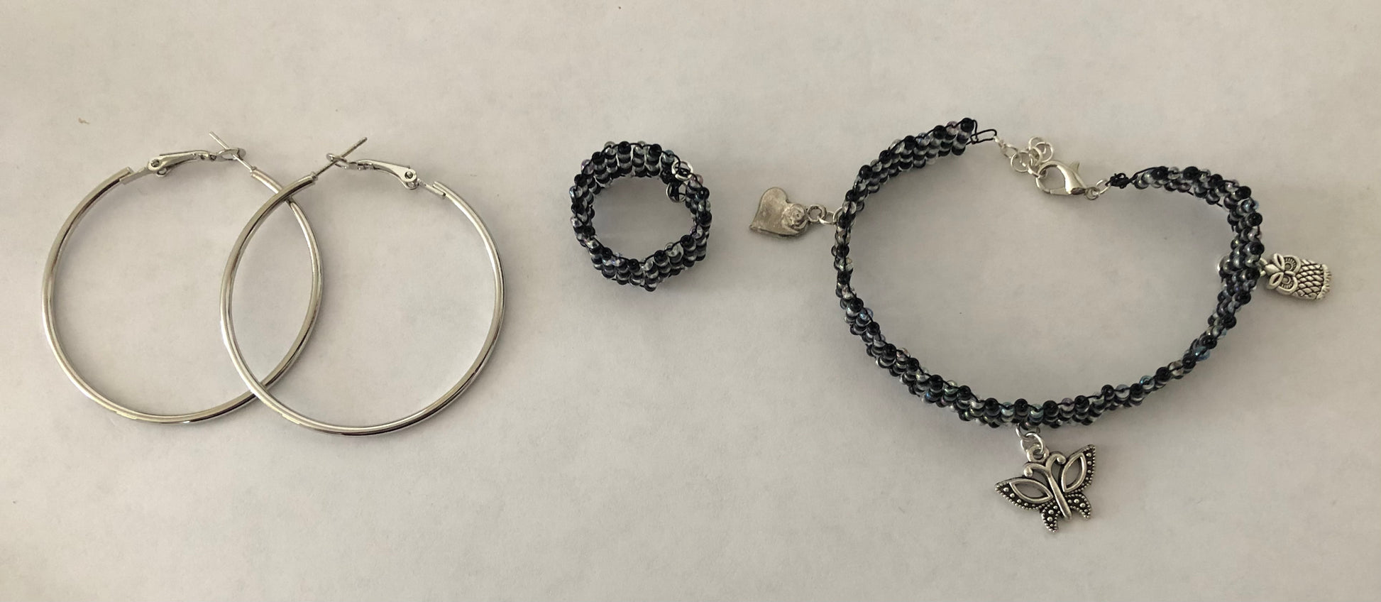 Jewelry set - Wire beaded bracelet and ring and a pair of hoops