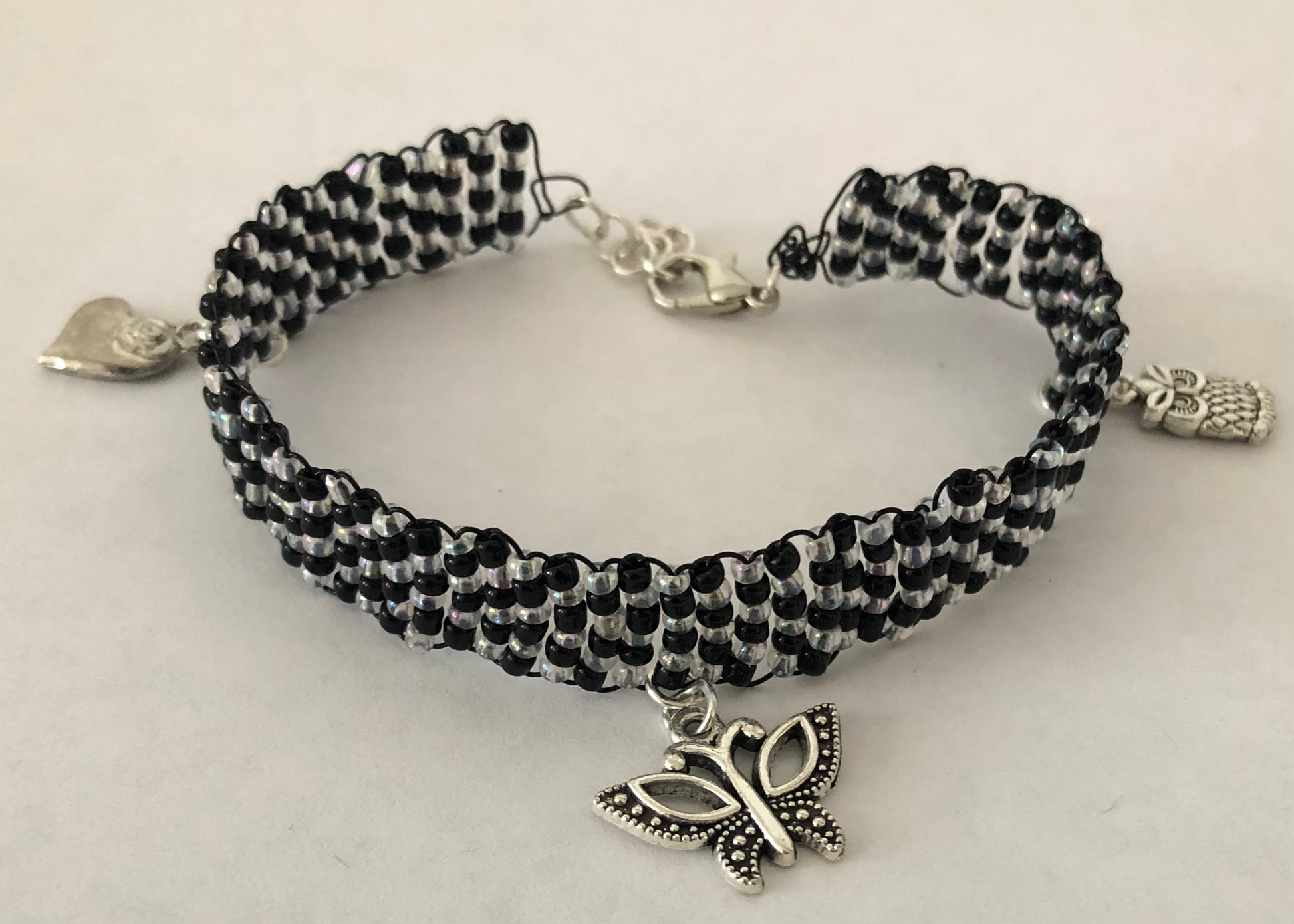 1 wire beaded bracelet in black and transparent with heart, butterfly and owl charms. Closure: hook