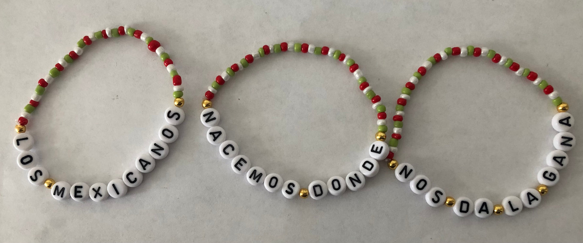 3 bracelets with the colors of the Mexican flag that say “Los mexicanos nacemos donde nos da la gana”