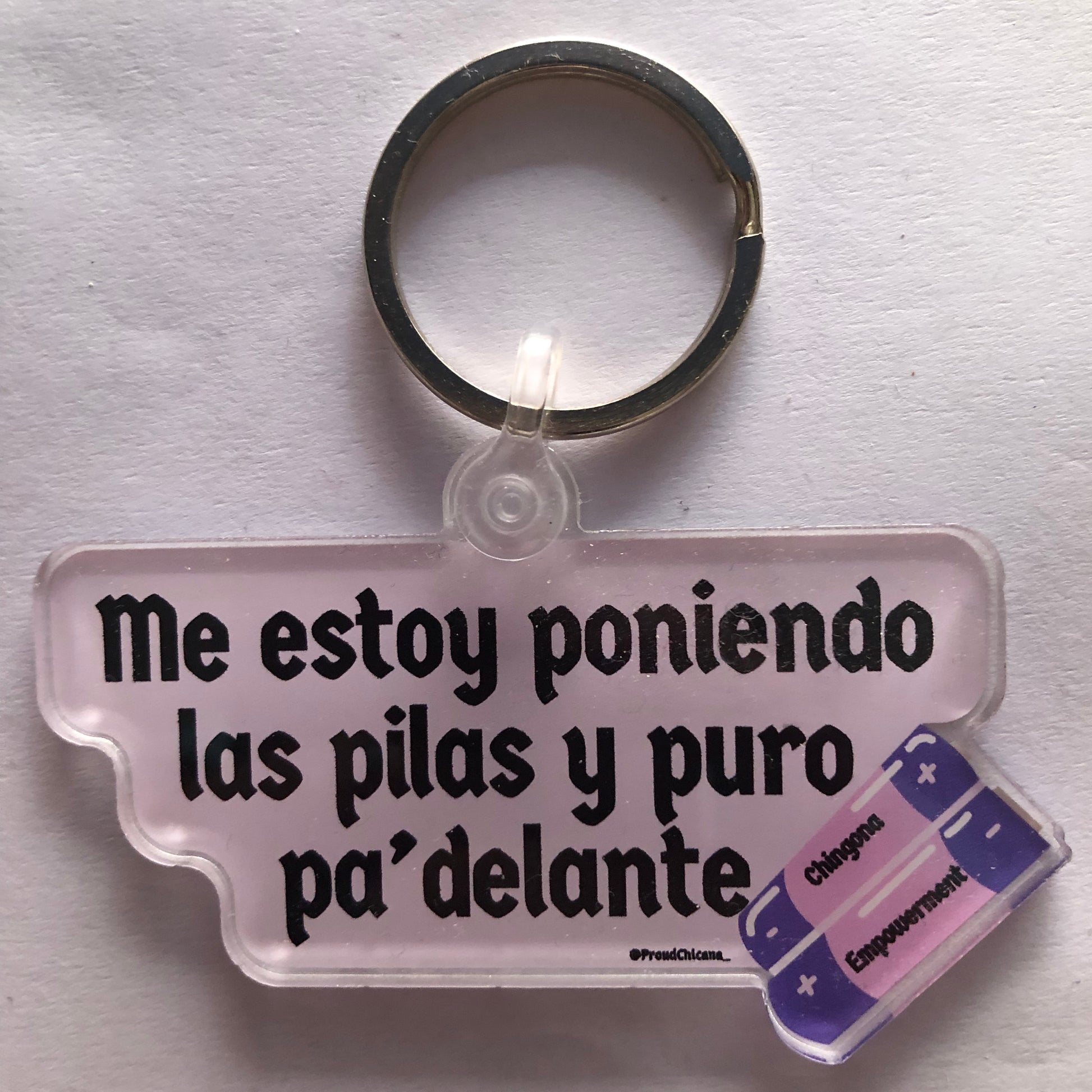 Beautiful keychain that says “Me estoy poniendo las pilas y puro pa’delante” and the batteries in the design say “Chingona” and “Empowerment”